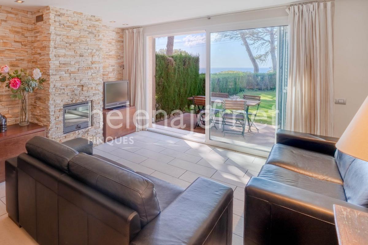 A la planta inferior, hi trobem una cuina totalment equipada amb mobiliari de la firma Santos i superfícies de Silestone, concebuda per oferir la màxima funcionalitat i confort en el dia a dia. En aquest mateix nivell s'ubica un generós saló-menjador, on destaca una paret de pedra natural i una llar de foc tipus cassette. Aquesta estança comunica directament amb el jardí, un espai idoni per al relax o el lleure familiar amb unes vistes privilegiades al mar.